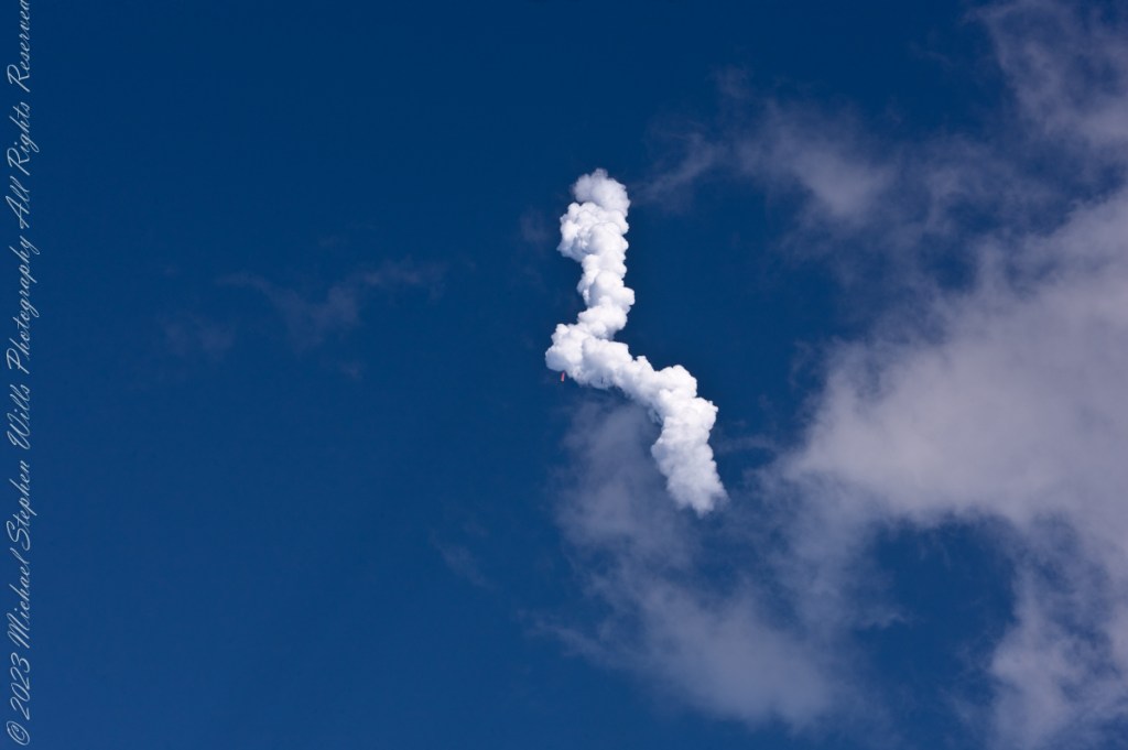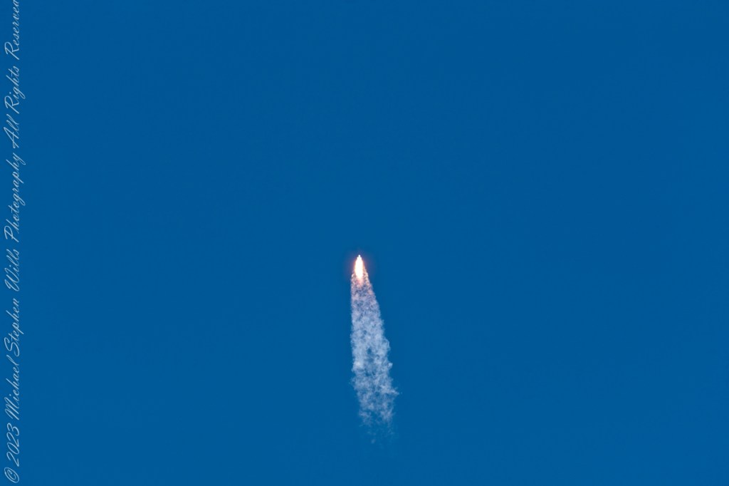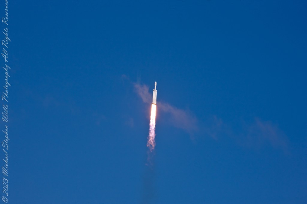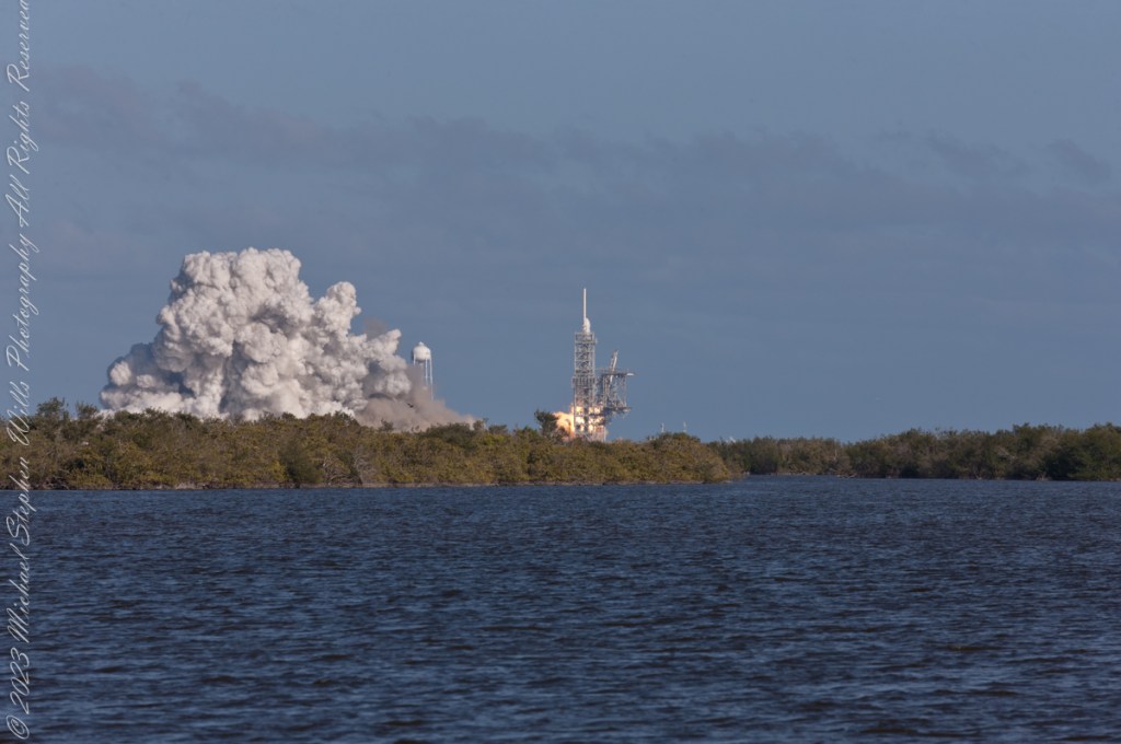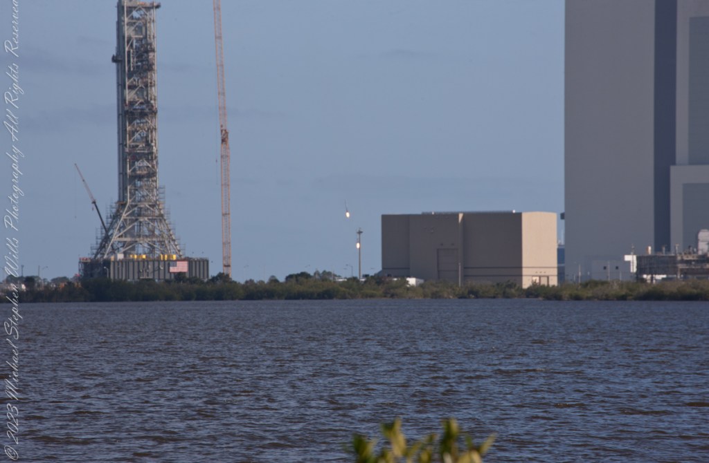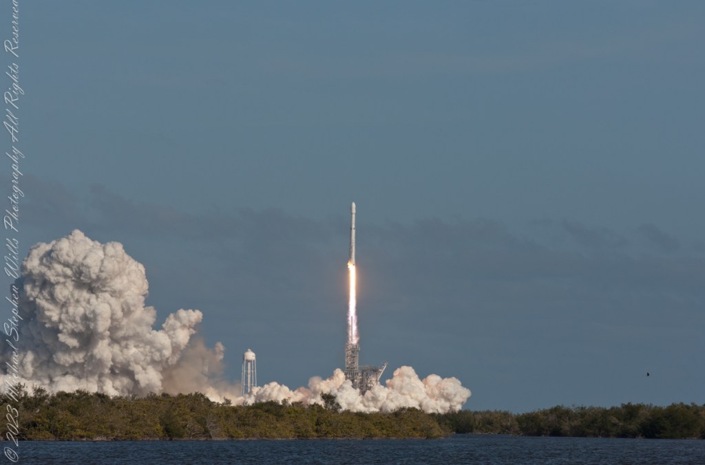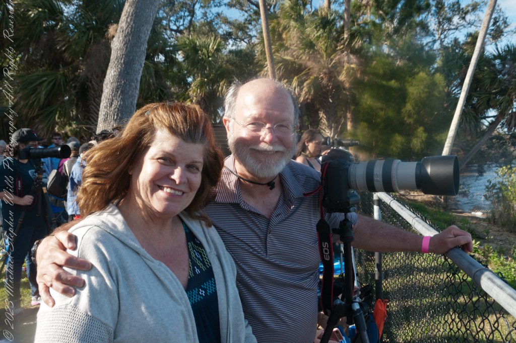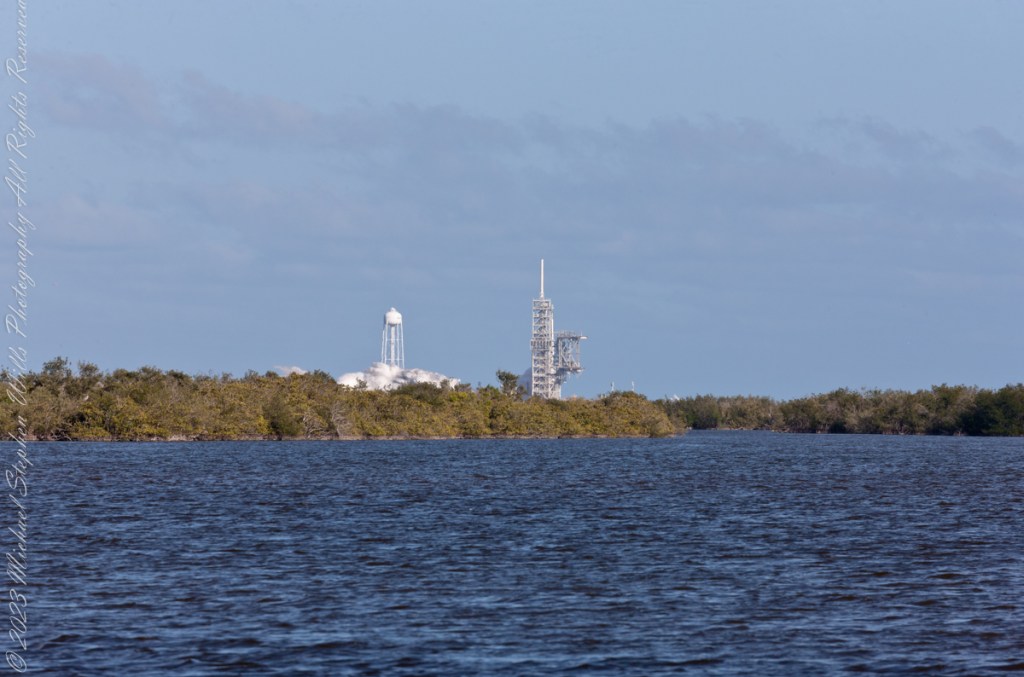 February 6, 2018 fuel venting during fueling of the Space X Falcon Heavy 19 minutes 25 seconds prior to launch. The rocket hidden by the launch tower. Taken from Kennedy Space Center Apollo-Saturn V Center looking across the Banana River to Launch Complex 39A, 3.9 miles away.Pam and Mike Wills in place at a prime spot for the SpaceX Falcon Heavy Launch. Kennedy Space Center, Apollo-Saturn V Center. February 6, 2018. 00:10:49 before launch.February 6, 2018 fuel venting, fueling complete 1 minute 20 seconds prior to launch. The rocket hidden by the launch tower. Taken from Kennedy Space Center Apollo-Saturn V Center looking across the Banana River to Launch Complex 39A, 3.9 miles away.February 6, 2018 Space X Falcon Heavy, 3 seconds prior to launch. The rocket hidden by the launch tower. The cloud is water released into the launch platform under pressure from the water tower. Taken from Kennedy Space Center Apollo-Saturn V Center looking across the Banana River to Launch Complex 39A, 3.9 miles away.February 6, 2018 Space X Falcon Heavy, launch 2 seconds prior to launch. The rocket hidden by the launch tower. The cloud is water released into the launch platform under pressure from the water tower. Taken from Kennedy Space Center Apollo-Saturn V Center loking across the Banana River to Launch Complex 39A, 3.9 miles away.February 6, 2018 Space X Falcon Heavy engine ignition. The moment of engine ignition, the rocket hidden by the launch tower. Taken from Kennedy Space Center Apollo-Saturn V Center loking across the Banana River to Launch Complex 39A, 3.9 miles away.February 6, 2018 Space X Falcon Heavy, launch plus 1 second. Ignition visible, tower connections falling away. Rocket nose visible to right of tower lightening rod. Taken from Kennedy Space Center Apollo-Saturn V Center loking across the Banana River to Launch Complex 39A, 3.9 miles away.February 6, 2018 Space X Falcon Heavy, launch plus 2 seconds. Rocket lift-off fully underway. Taken from Kennedy Space Center Apollo-Saturn V Center looking across the Banana River to Launch Complex 39A, 3.9 miles away.February 6, 2018 Space X Falcon Heavy, launch plus 4 seconds. Rocket not yet clear of launch tower. Taken from Kennedy Space Center Apollo-Saturn V Center looking across the Banana River to Launch Complex 39A, 3.9 miles away.February 6, 2018 Space X Falcon Heavy, launch plus 5 seconds. A heron flies to the right of launch tower. Taken from Kennedy Space Center Apollo-Saturn V Center looking across the Banana River to Launch Complex 39A, 3.9 miles away.February 6, 2018 Space X Falcon Heavy, launch plus 6 seconds. Rocket is just clear of launch tower. At 230 feet in 6 seconds it is travelling at 26.1 miles per hour. A heron flies to right of launch tower. Taken from Kennedy Space Center Apollo-Saturn V Center looking across the Banana River to Launch Complex 39A, 3.9 miles away.February 6, 2018 Space X Falcon Heavy, launch plus 7 seconds. Rocket is clear of the launch tower. Taken from Kennedy Space Center Apollo-Saturn V Center looking across the Banana River to Launch Complex 39A, 3.9 miles away.February 6, 2018 Space X Falcon Heavy, launch plus 7 seconds. Taken from Kennedy Space Center Apollo-Saturn V Center looking across the Banana River to Launch Complex 39A, 3.9 miles away.February 6, 2018 Space X Falcon Heavy, launch plus 8 seconds. Taken from Kennedy Space Center Apollo-Saturn V Center looking across the Banana River to Launch Complex 39A, 3.9 miles away.February 6, 2018 Space X Falcon Heavy, launch plus 9 seconds. Taken from Kennedy Space Center Apollo-Saturn V Center looking across the Banana River to Launch Complex 39A, 3.9 miles away.February 6, 2018 Space X Falcon Heavy, launch plus 12 seconds. Taken from Kennedy Space Center Apollo-Saturn V Center.February 6, 2018 Space X Falcon Heavy, launch plus 20 seconds. The rocket has rolled a few degrees, all boosters are visible. The Taken from Kennedy Space Center Apollo-Saturn V Center.February 6, 2018 Space X Falcon Heavy, launch plus 25 seconds. All boosters are visible. Taken from Kennedy Space Center Apollo-Saturn V Center.February 6, 2018 Space X Falcon Heavy, launch plus 26 seconds. All boosters are visible. Taken from Kennedy Space Center Apollo-Saturn V Center.February 6, 2018 Space X Falcon Heavy, launch plus 32 seconds. A boosters are visible. Taken from Kennedy Space Center Apollo-Saturn V Center.February 6, 2018 Space X Falcon Heavy, launch plus 1 minute 11 seconds. The boosters have throttled back. Taken from Kennedy Space Center Apollo-Saturn V Center.February 6, 2018 Space X Falcon Heavy, launch plus 1 minute 57 seconds. The cloud was formed from the throttled back boosters. The rocket is visible near center of frame. Taken from Kennedy Space Center Apollo-Saturn V Center.February 6, 2018 Space X Falcon Heavy, launch plus 6 minutes 37 seconds. Firing thrusterrs of the two returning boosters are visible a bit above the center of frame. Taken from Kennedy Space Center Apollo-Saturn V Center.February 6, 2018 Space X Falcon Heavy, launch plus 7 minutes 50 seconds. Both boosters visible firing thrusters between the SLS Launch Tower and NASA Vehicle Assembly Building. Taken from Kennedy Space Center Apollo-Saturn V Center loking across the Banana River.February 6, 2018 Space X Falcon Heavy, launch plus 8 minutes 2 seconds. Both boosters visible firing thrusters between the SLS Launch Tower and NASA Vehicle Assembly Building. Taken from Kennedy Space Center Apollo-Saturn V Center loking across the Banana River.February 6, 2018 Space X Falcon Heavy, launch plus 8 minutes 3 seconds. Both boosters visible firing thrusters between the SLS Launch Tower and NASA Vehicle Assembly Building. Taken from Kennedy Space Center Apollo-Saturn V Center loking across the Banana River.