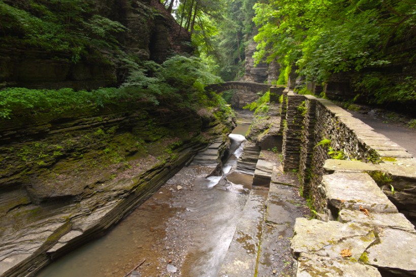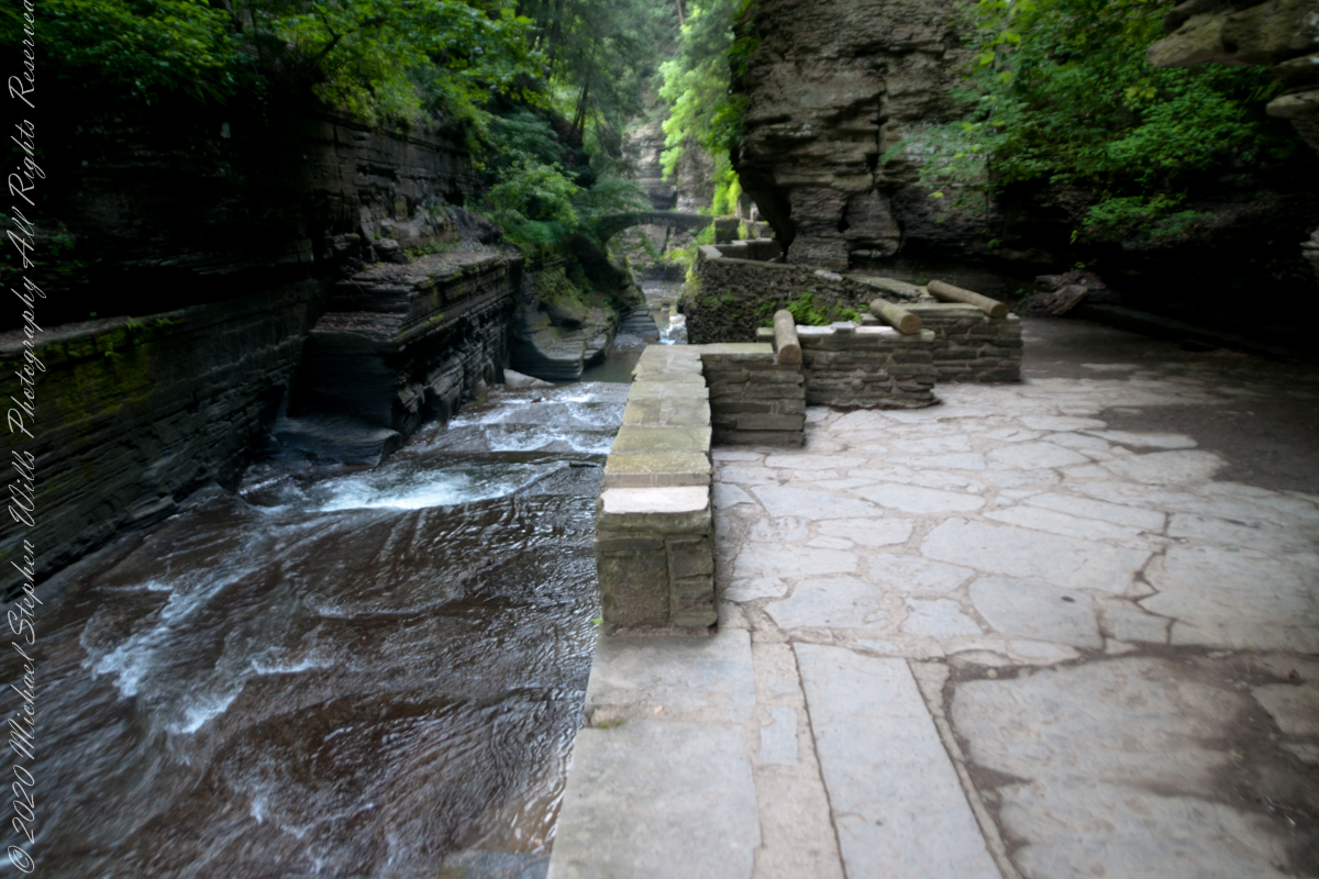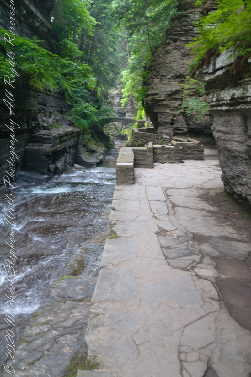Treman Gorge Trail from the Old Mill enters a narrow gallery looking here southeast along Enfield Creek, passing over a stone footbridge.