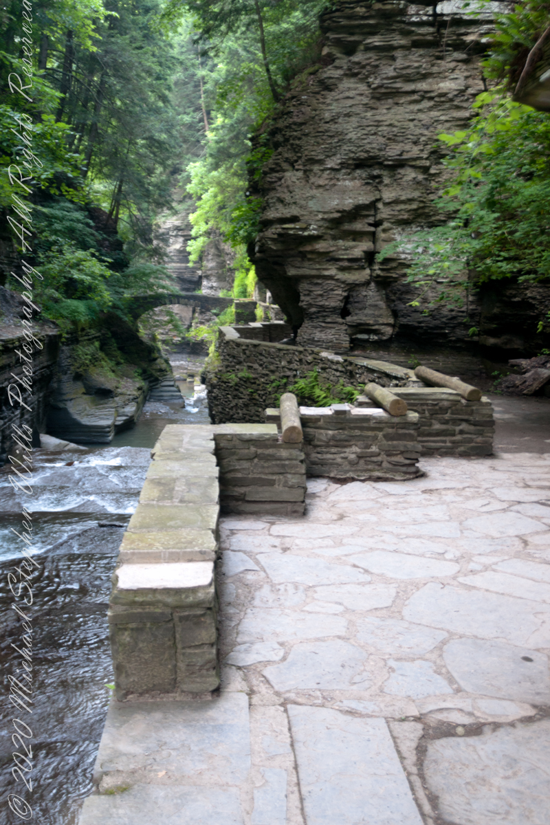 Treman Gorge Trail from the Old Mill enters a narrow gallery looking here southeast along Enfield Creek, passing over a stone footbridge. This was the control point in the 19th century for collecting the ten cent admission fee. Here are some photographs of the entrance as it exists today. The retaining wall, footpath and stone bridge were constructed in the 1930’s by the Civilian Conservation Corps. The site was far rougher for those earlier visitors.