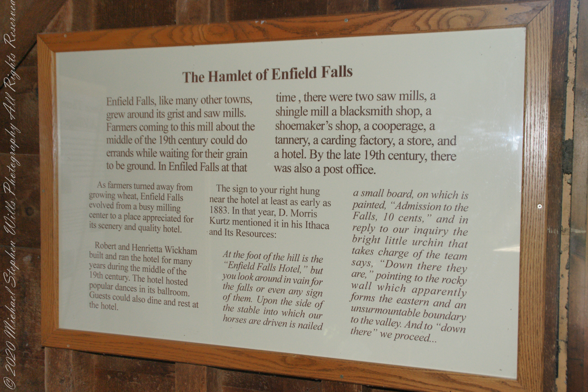 “As farmers turned asway from growing wheat, Enfield Falls evolved from a busy milling center to a place appreciated for scenery and a quality hotel. Robert and Henrietta Wickham build and ran the hotel for many years during the middle of the 19th century. The hotel hosted popular dances in its ballroom. Guests could also dine and rest at the hotel.”