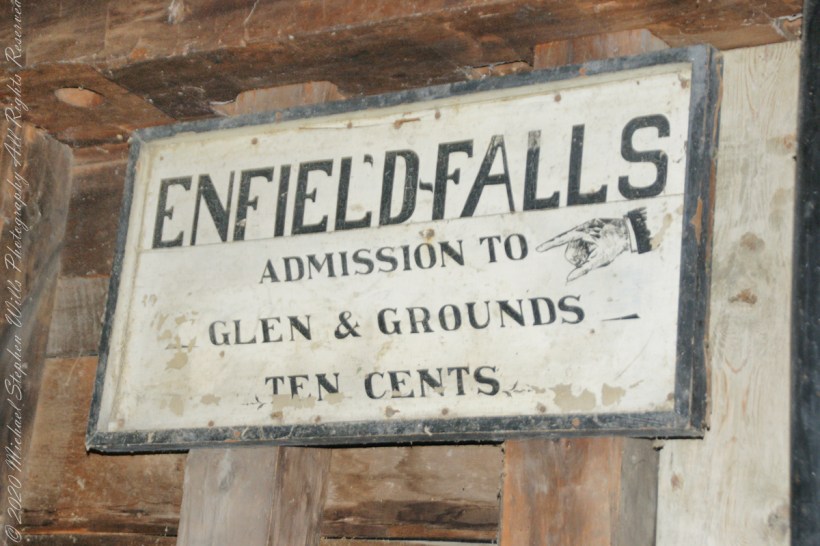 The sign in the heading of this post “hung near the hotel at least as early as 1883. In that year, D. Morris Kurtz mentioned it in his “Ithaca and Its Resources”: “At the foot of the hill is the Enfield Falls Hotel, but you look around in vain for the falls or even any sign of them. Upon the side of the stable into which our horses are driven is nailed a small board, on which is painted ‘Admission to the Falls, 10 cents.’ In reply to our inquiry the bright little urchin that takes charge of the team says, ‘Down there they are,’ pointing to the rocky wall which apparently forms the eastern and an unsurmountable boundary to the valley. And to ‘down there’ we proceed……“