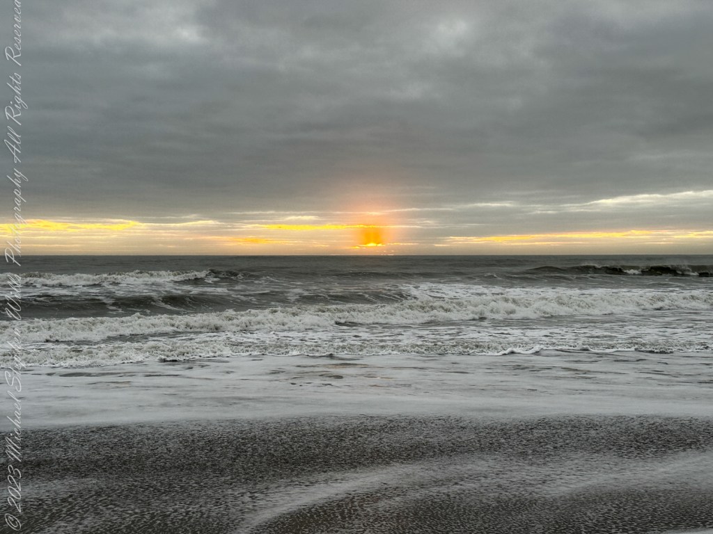 The last push to the saddle is steep, the steps uneven, the sky now a cascade of colors—copper, rose, faint lavender melting into a high dome of blue. The silhouettes of distant ranges sharpen: the Estrellas?, the Superstitions?, low ridges whose names I do not know. On the horizon, the first thin line of sun breaks free, setting fire to the edges of clouds. In another photograph, framed by dark rock and desert trees, that sunrise becomes a golden portal at the end of a shadowed corridor of stone.