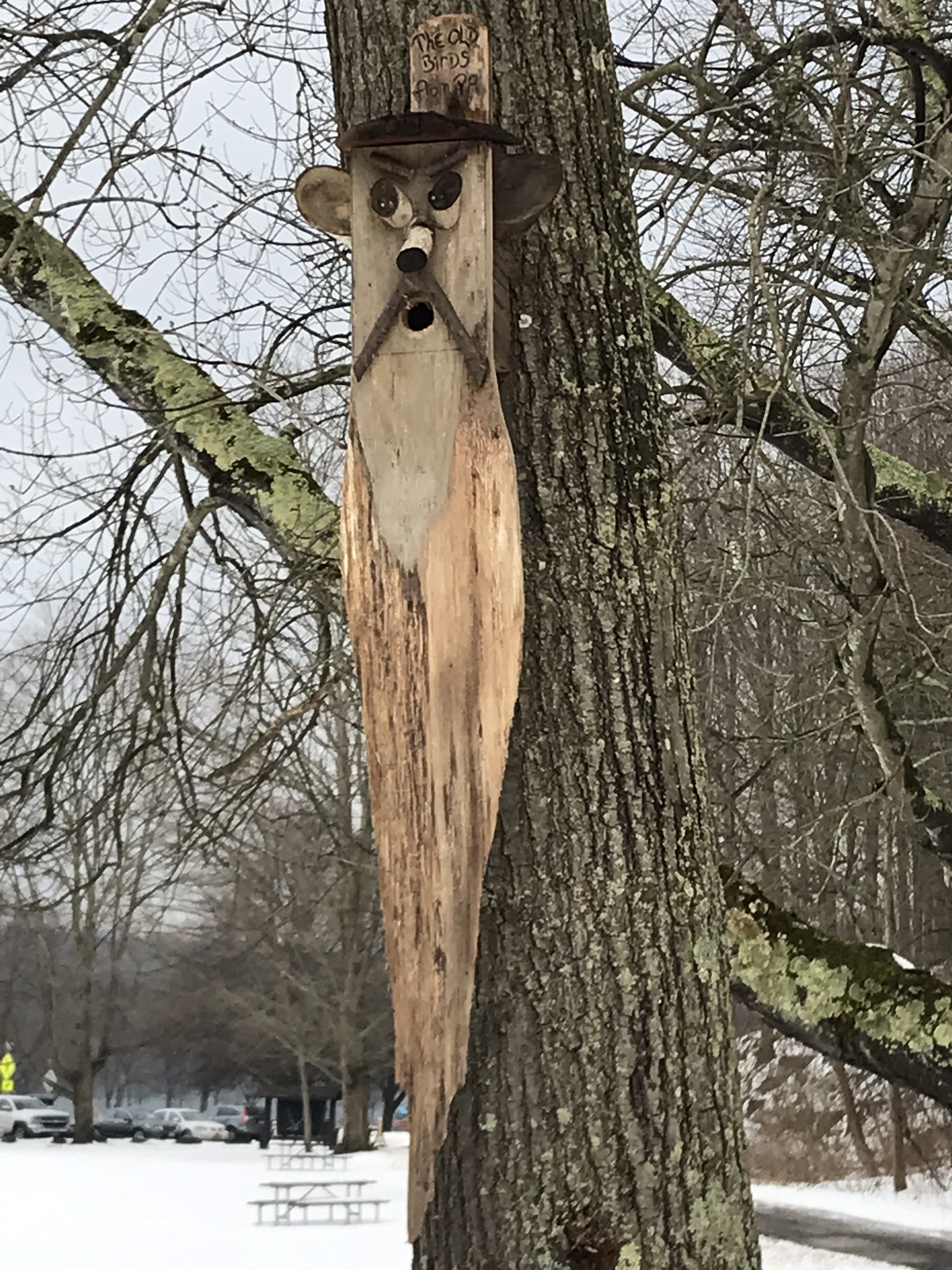 We had a reminder mid-February marks the start of avian mating behavior with this addition to the view from Taughannock Creek, the first large waterfall. For the cold, drizzly excursion I chose the IPhone, in a waterproof case, for the images. The fanicful birdhouse inscription reads “The Old Birds from Pa.”