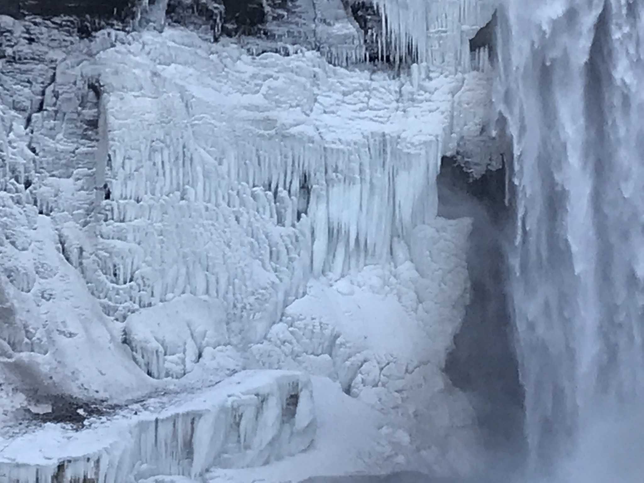 Of all the area hiking experiences, Taughannock Gorge Trail is the only one available year round. The gorge is wide with enough room for the footpath to avoid the cliff edge. Today, there were places were ice formations were throwing large ice chunks down the slope. The park ranges place tree trunks along the cliff base, with warning signs to stay away. Still, there are visitors who stray too close with fatal outcomes reported by local news.