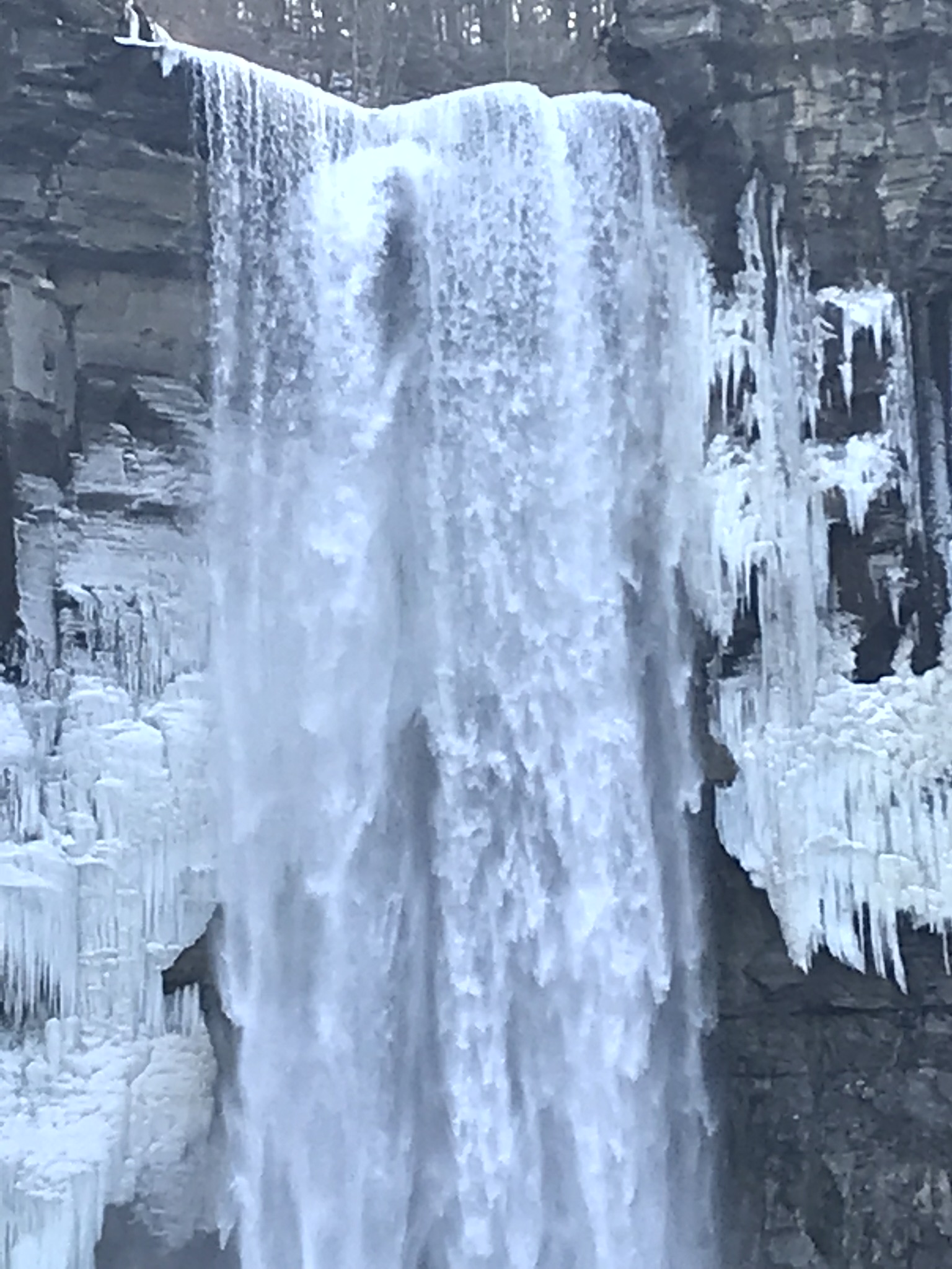 Pam and I were drawn outside the day after Valentine’s a bit of sun, an unreliable warm breeze, a promise of exercise. Our expectations were disappointed for all but the last at the foot of the Taughannock Falls gorge trail.