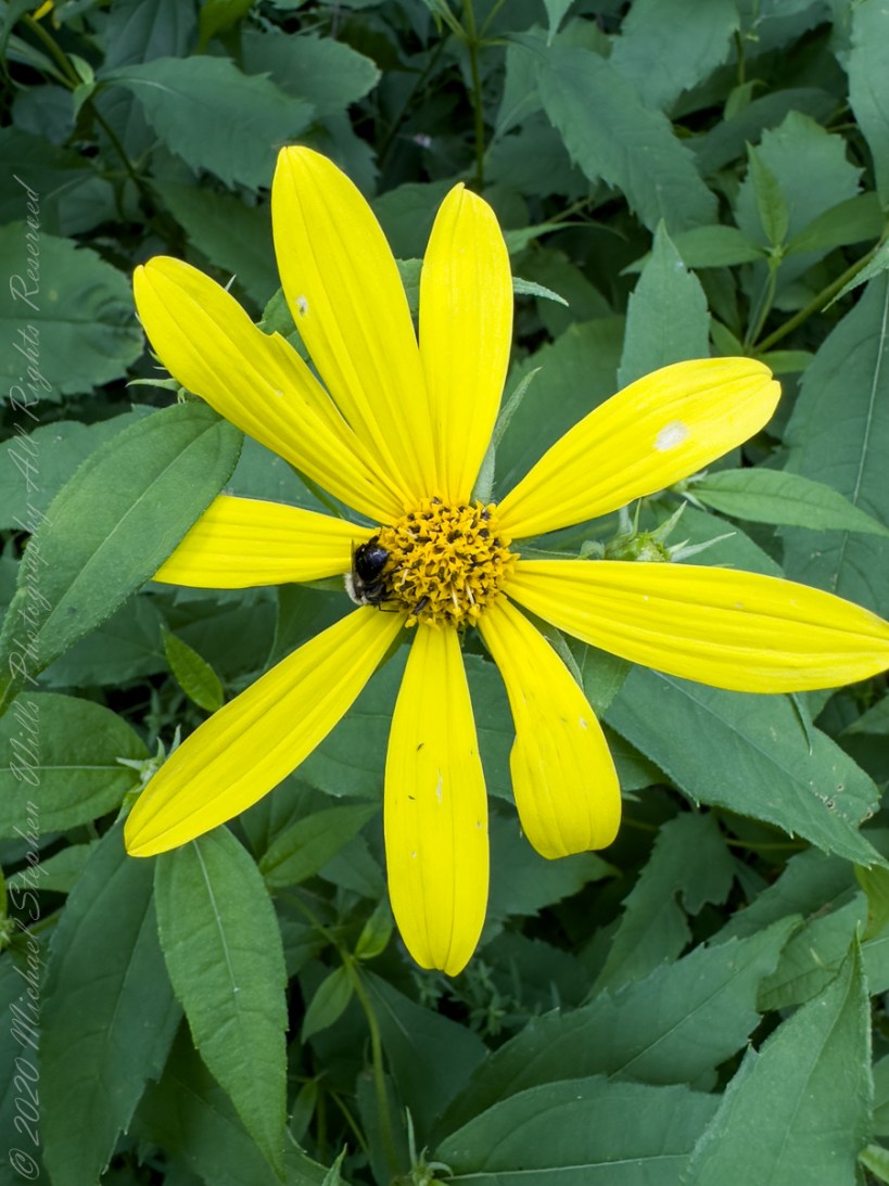 As with other members of the family Asteraceae, Thin Leaved Sunflowers are composed of ray florets. The scientific species name “decapetalus” is inaccurate on several counts. The flower is composed of 8-12 (not only 10, as in “deca”) of these ray florets, not petals. These ray florets are part of the flower reproductive organs, a flower petal is adjacent to, not a component of, a flowers reproductive parts.