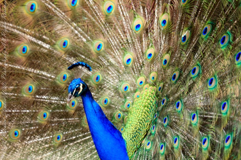 The iridescent coloration is an illusion created by the structure of fine feather elements, called barbules. The impression on peahens varies with viewing angle, between 90 (head on) and 45 degrees to either side. The peacock will shiver his train when faced with a favored peahen.