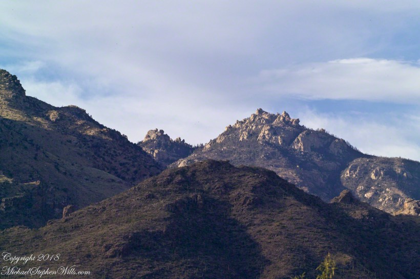 With a 25-pound pack on my back, walking from the parking lot I looked up at the incredible rock formations of the Santa Catalina mountains. It took some time to set up the tripod (at that time I was using a cheap swivel head on adjustable aluminum legs) with a 200mm telephoto lens (Canon L-series EF 200mm USM) I grabbed this shot of the hoodoo fringed peaks beyond the foothills (f16, 1/30, ISO160). The lower sun angle made the formations pop out.