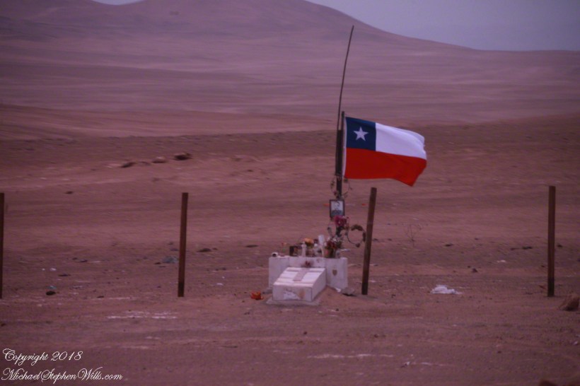 May 1879 was in the initial phase of the War of the Pacific, fought over rich mineral deposits of the Atacama desert. Today, the Chilean flag is over these barren wastes, seen here flying over a roadside memorial to an automobile accident victim. The desert is the backdrop, there are no animals or plants here, only red dirt. NASA uses the Atacama in simulations of the Martian environment.