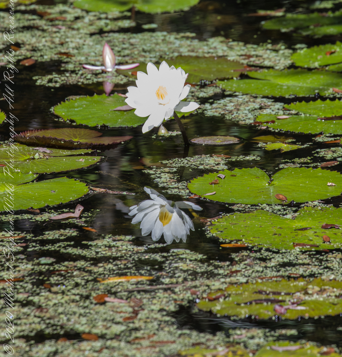 Look closely for flowers and buds of the White Water Lily native to New York State.