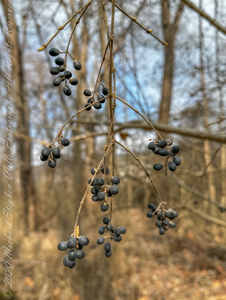 The flowers of this small shrub identify it as a member of the Rose family. The berries I captured in the following photograph are edible (non-poisonous), though astringent. Autumn time, the leaves turn red. It is native to eastern North America. I found these berrys along the Renwick Wood trail.