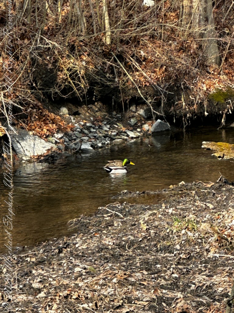 A pair of Mallard ducks foraging along a Fall Creek bayou on the edge of Renwick Woods where Stewart Park begins.