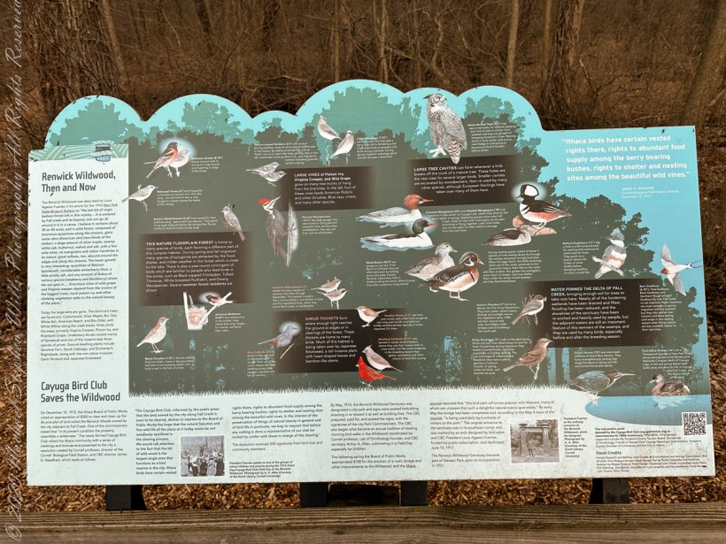 This large sign found along the Cayuga Waterfront Trial at the entrance to Renwick Woods. It provides the origin story (floodplain, delta of Fall Creek), how it came to be conserved and the importance of the place to birds.