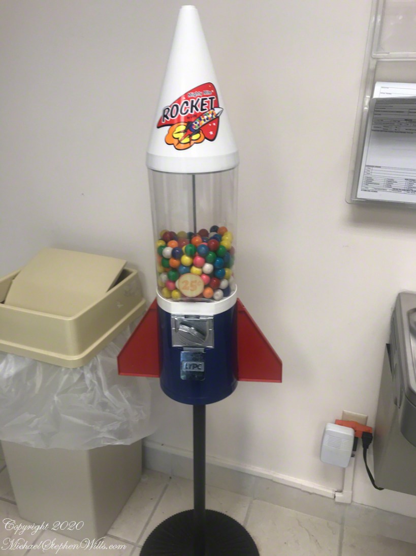 Waves built from onshore wind, fast, steady overnight, through the day from early morning until sunset. Pam and I adapted with a revisit to the Sands Space History Museum, Cape Canaveral just outside the Air Force Station. Click this link for a previous posting, “Cape Canaveral Lighthouse,” first of a series. This post header is a vintage gumball machine from the lobby.