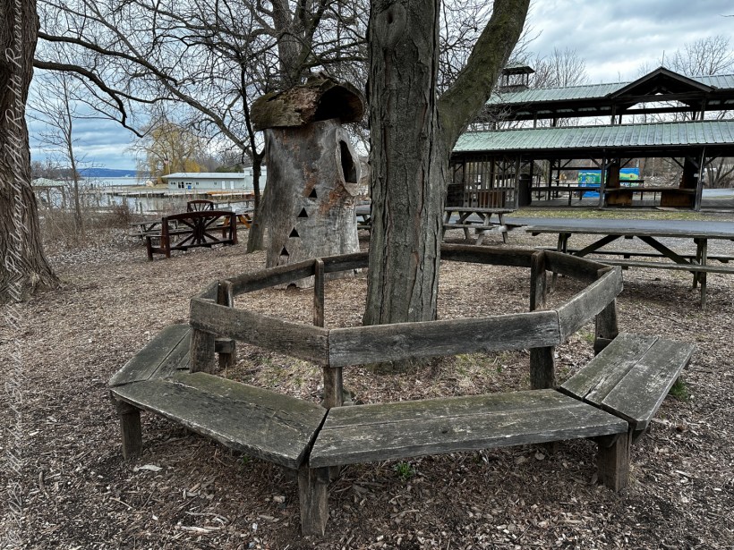 A circular bench that has seen better days, a hollowed out tree trunk repurposed as a children’s playgound house, picnic benches and, in background, a portion of the Farmer’s Market pavilion, to the right is Johnson Boatyard, Cayuga Inlet and lake. This is the Steamboat Landing, historically the southern port on Cayuga Lake. Cayuga Waterfront Trail, Ithaca, Tompkins County, Finger Lakes Region, New York State.