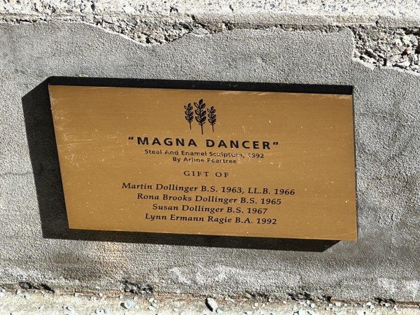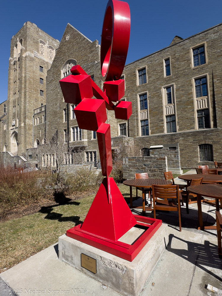 Reaching the top of the steps, I encountered, at the entrance to Hughes Hall museum, the striking “Magna Dancer” sculpture by Arline Peartree. Its bold red forms stood out vividly against the backdrop of the historic stone buildings. The plaque at the base provided a glimpse into its significance, commemorating the contributions of Cornell alumni. The sculpture’s dynamic lines and vibrant color injected a sense of modernity into the historic setting.